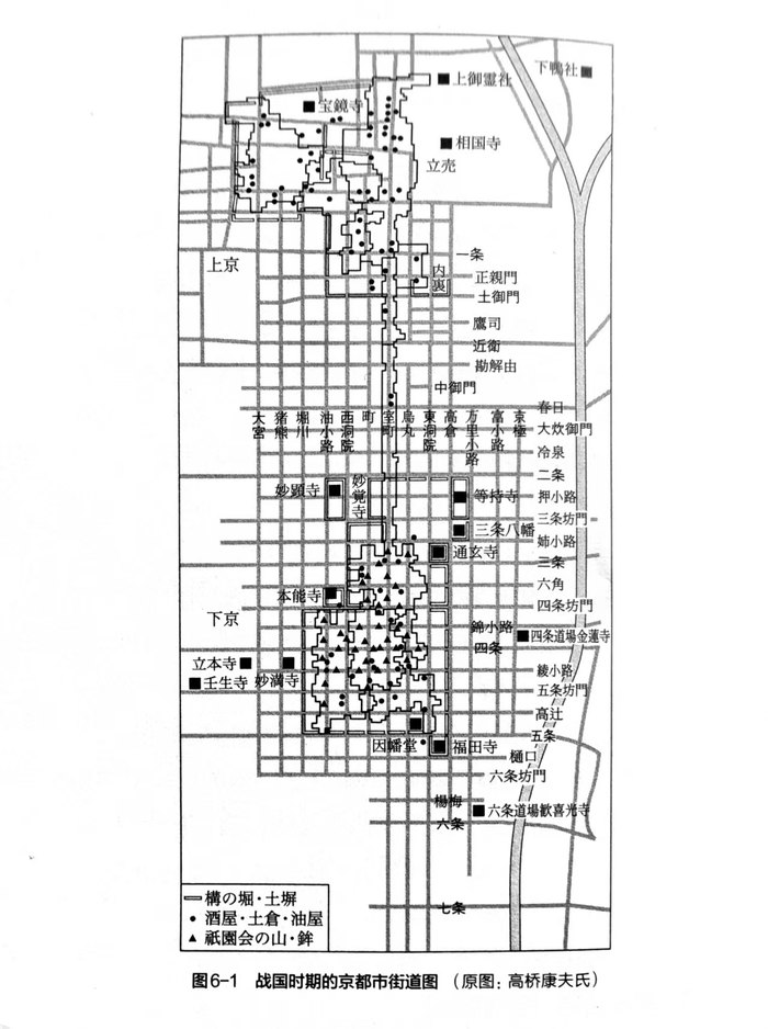 在德川家康的二条城建成前,还有一座由织田信长为末代室町幕府将军足利义昭修建的二条城。旧二条城是为了代替毁于战火的将军祖宅室町殿——“室町幕府”之名便来自于此。 “应仁之乱”后京都几乎被彻底摧毁,京都的残骸被分成了两个群体构成迥异的区域:远离市区,以武家为中心、贵族和寺院神社林立的“上京”;普通民众和工商业密集的“下京”,也就是如今的三条大街到五条大街附近。
