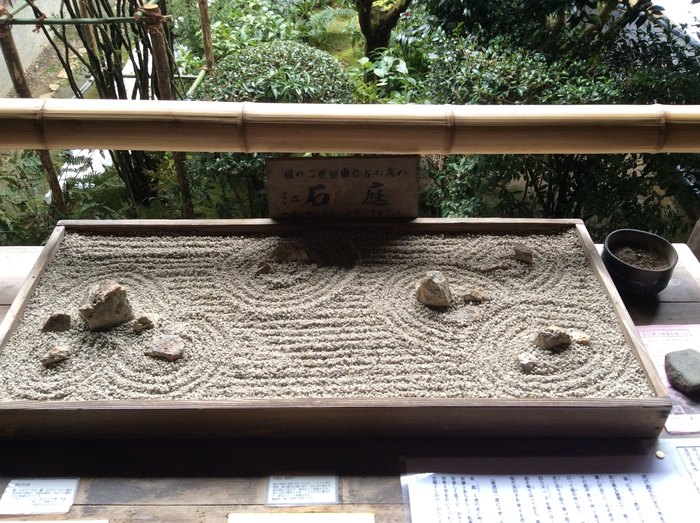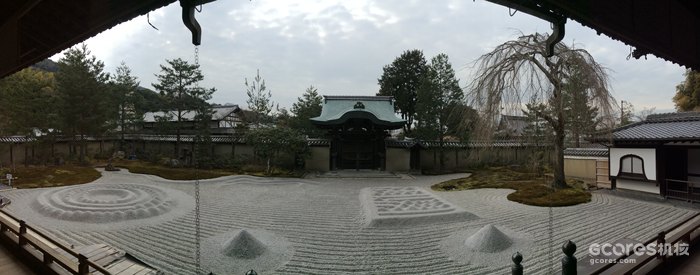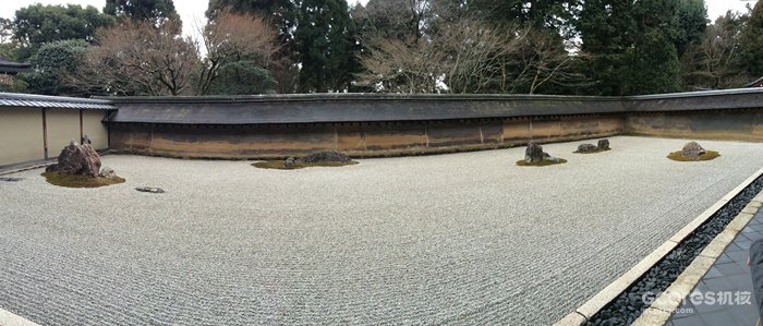 在约 250 平方米的空间里,15 块大小各异的石头镶嵌在白色的沙子上,布局看似简单,却富含深意且充满谜团:有人说它表示海中的小岛或云海中的山峦;有人则认为是一只雌虎带着幼虎渡河。就像一个禅宗公案,它取决于当局者自己的诠释和想象。我自认为缺少“慧根”,便只坐在庭前静静欣赏。