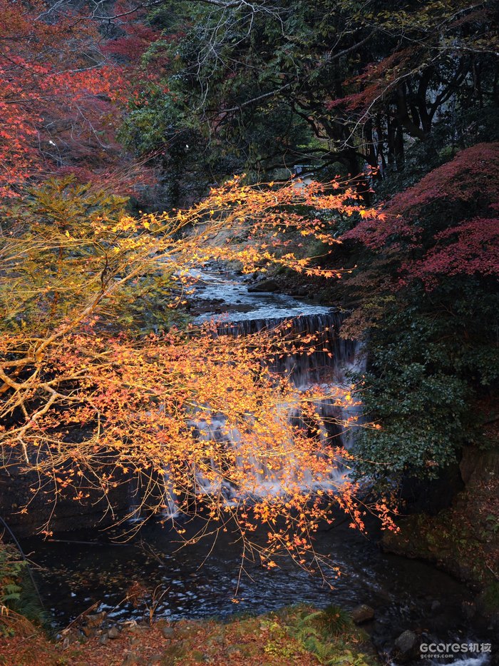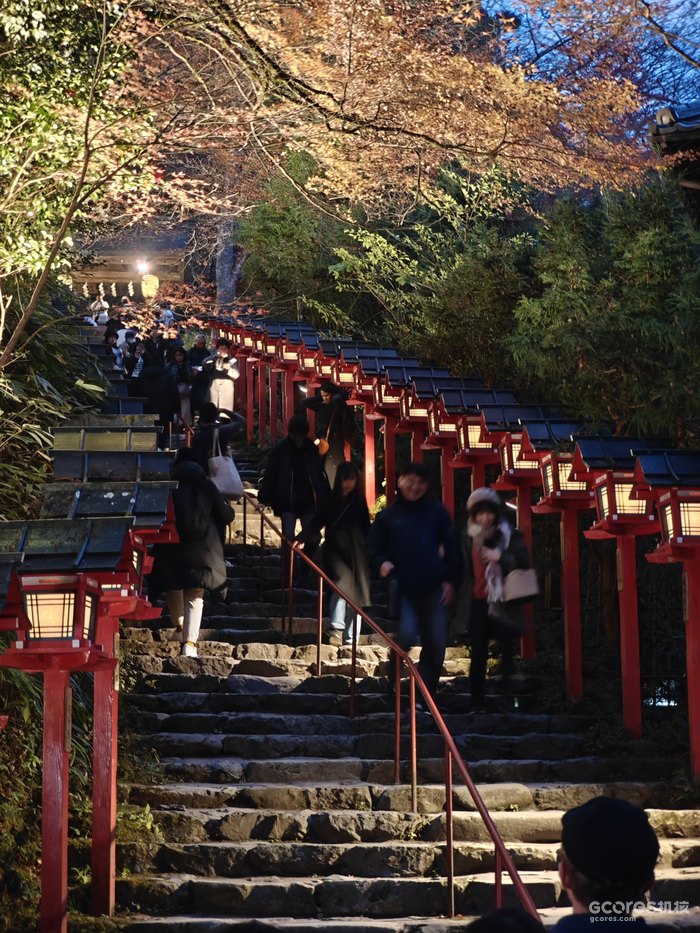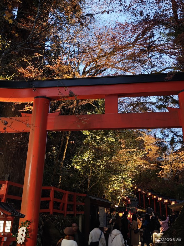 贵船神社周围四季风物引人入胜:春天的新绿、夏天的川床料理、秋天绚丽的红叶、冬天梦幻的雪景吸引着世界各地游客的脚步。我此行为红叶季节神社的夜间亮灯活动:夜色中本宫前长约百米的石阶两侧,鳞次栉比地排列着数十座灯笼,它们幽暗的光透过红叶,营造出一种幽玄的氛围。