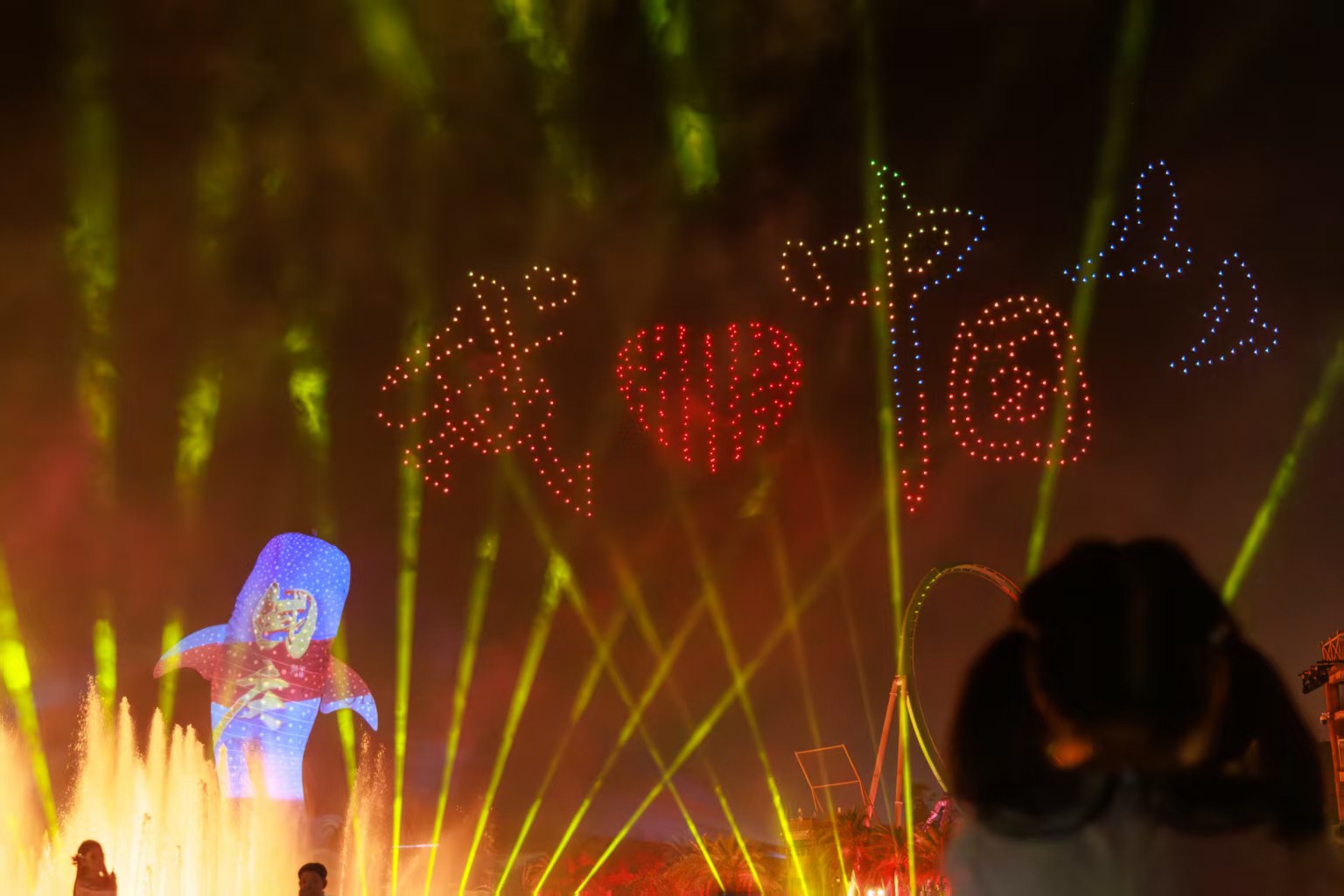 广东珠海长隆海洋王国推出特色光影秀,为游客献上了视觉盛宴——超600台无人机的编队变幻出企鹅、鲸鲨等珍稀海洋动物,结合绚烂的灯光投影以及红色主题的节目编创,再加上珠海科技“特产”无人船,360度环绕烟花效果……