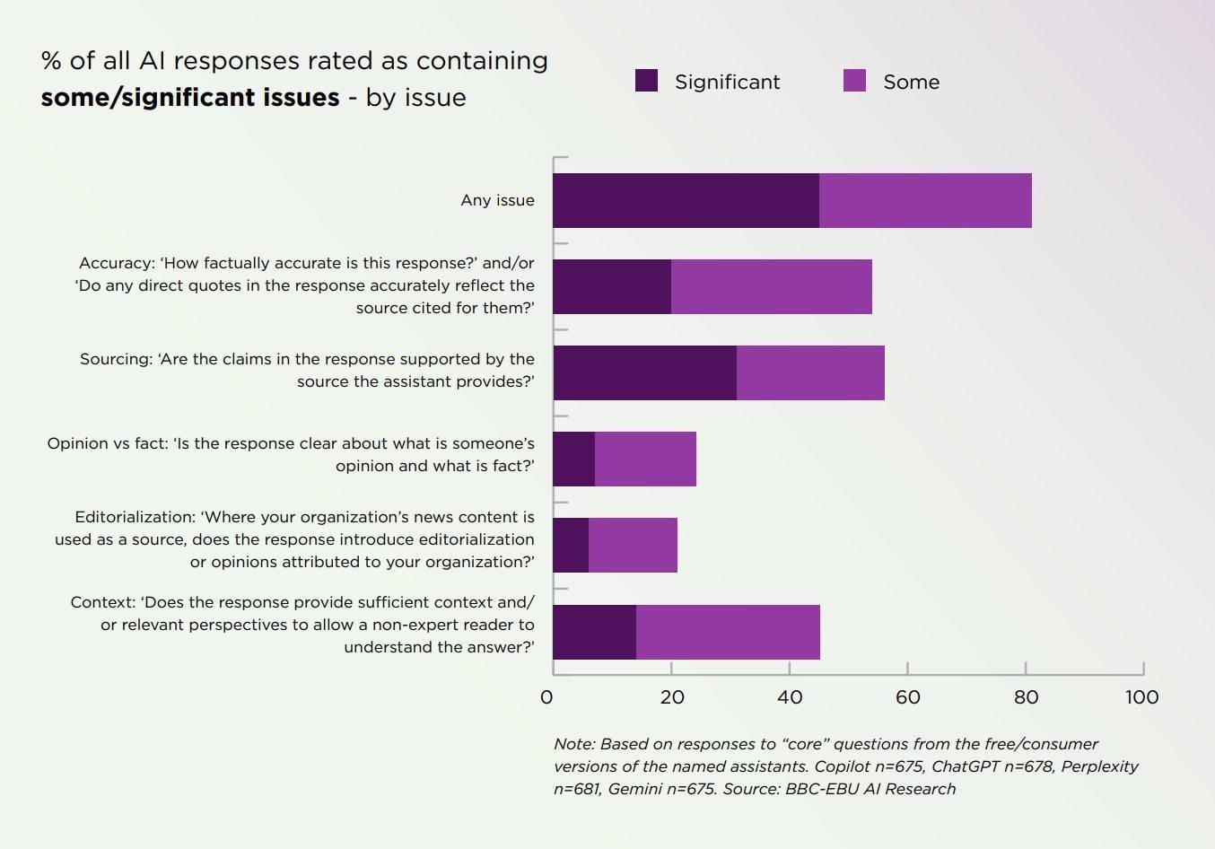 研究指出,Gemini 的问题主要包括:缺乏清晰的资料来源链接、未能区分可靠信息与讽刺内容、过度依赖维基百科、缺乏足够语境,以及错误引用原文。