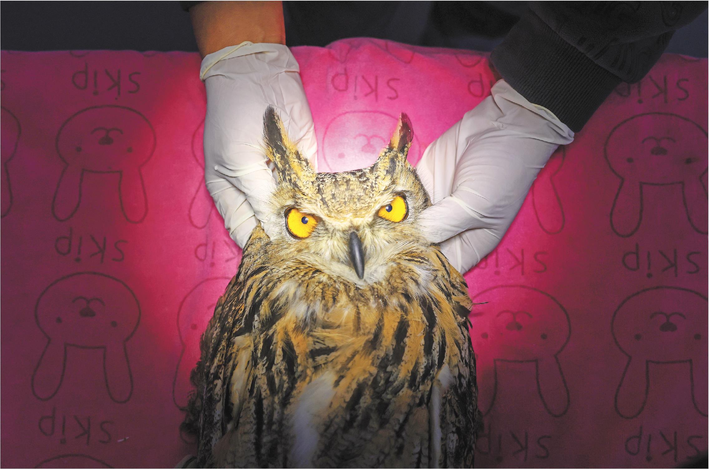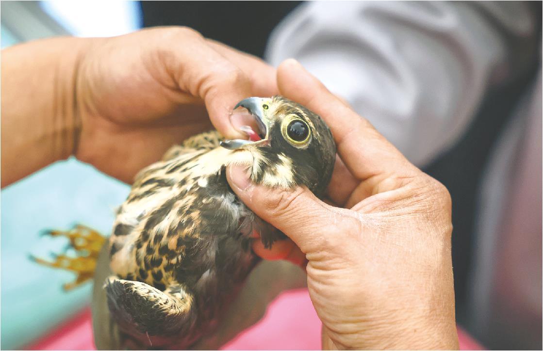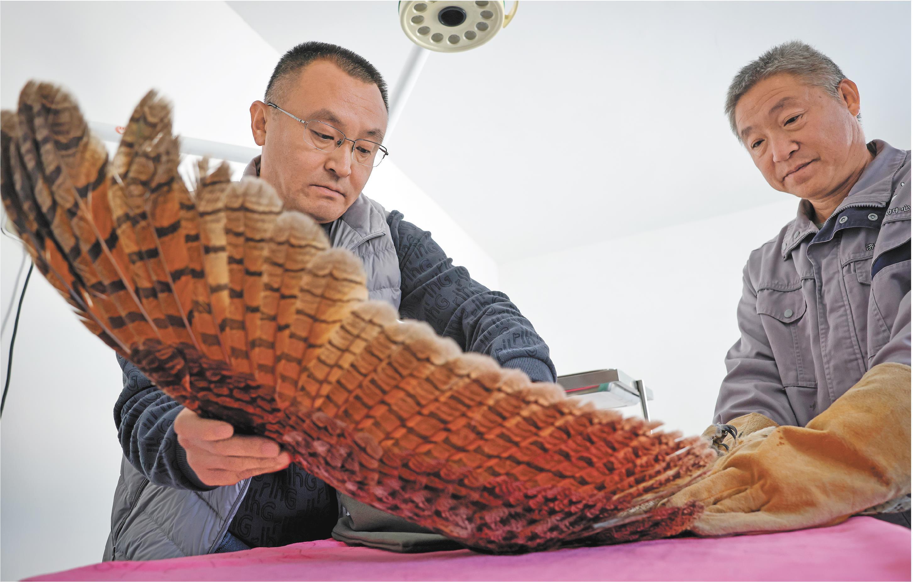 11月4日上午,胡海磊和救助员牛兆理剁了肉兔喂鸟,又给一只四五斤重的雕鸮体检。这雕鸮翅膀伤在要害,想再飞上天难了,胡海磊轻手轻脚喂了它营养液。5日,莱芜职业技术学院的志愿者送来冷冻兔肉,还跟着一起给一只燕隼做检查,合格了,套上环志就放了——这些环志,能给生态研究递些实在数据。
